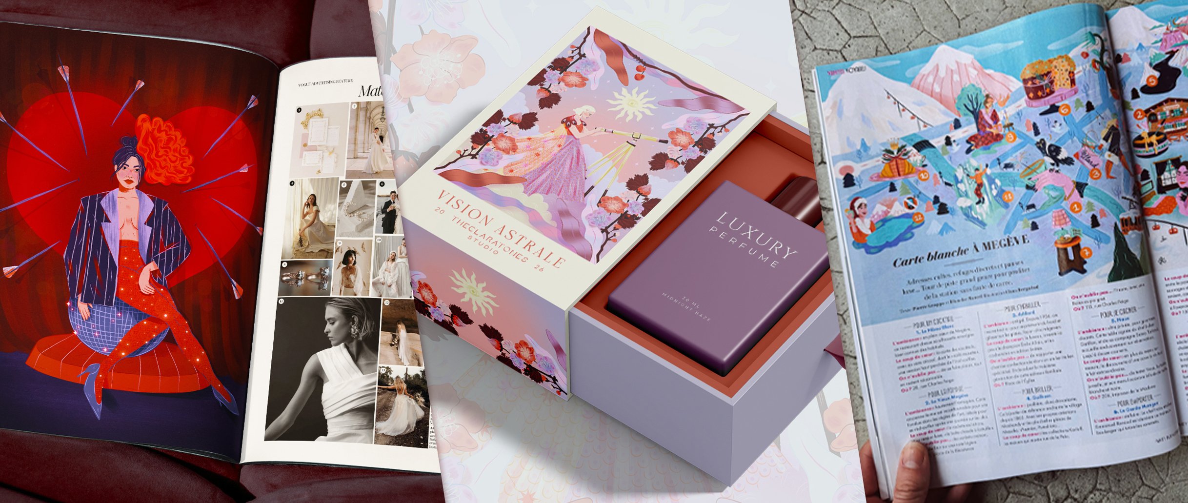J’accompagne les maisons de luxe, marques de mode ou de cosmétique avec des visuels sur mesure : campagnes, lancements, éditions spéciales, packagings illustrés. Je souhaite mêler élégance, sens du détail et storytelling pour mettre en avant l’univers de la marque. L’objectif : des images sensibles et désirables, cohérentes avec l’ADN de la maison.